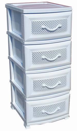 Комод из пищевого пластика с четырьмя выдвижными ящиками предназначен для хранения вещей и продуктов питания. Он гармонично впишется в интерьер любой комнаты. Легкий и вместительный комод поможет обеспечить порядок в доме. Узор на передних панелях придаст индивидуальность и подарит настроение.Не рекомендуется размещение пластикового комода вблизи батарей центрального отопления и электрических обогревателей.
