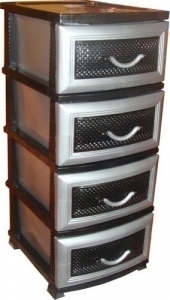 Комод из пищевого пластика с четырьмя выдвижными ящиками предназначен для хранения вещей и продуктов питания. Он гармонично впишется в интерьер любой комнаты. Легкий и вместительный комод поможет обеспечить порядок в доме. Узор на передних панелях придаст индивидуальность и подарит настроение.Не рекомендуется размещение пластикового комода вблизи батарей центрального отопления и электрических обогревателей.