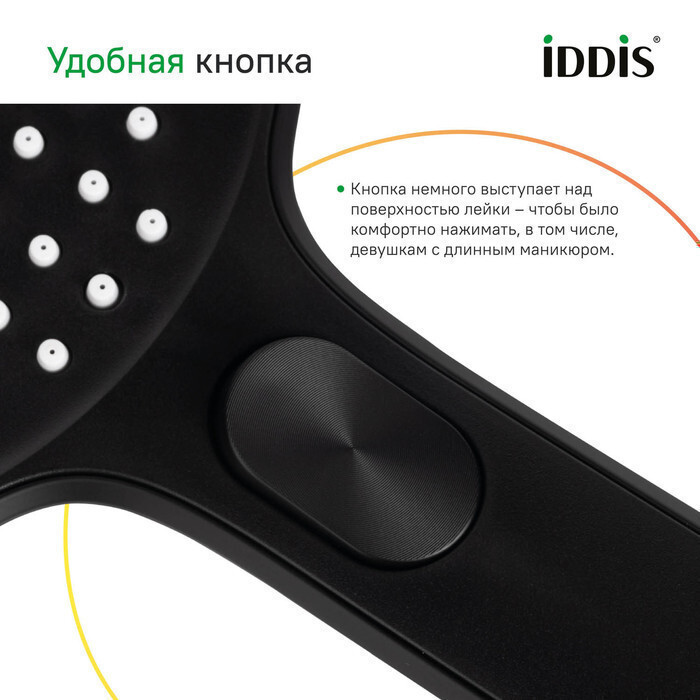 Черная матовая душевая лейка Esper – универсальный аксессуар для смесителей и душевых систем в популярной круглой форме. Оптимальный диаметр 130 мм и эргономичный дизайн делают ее удобной для использования всеми членами семьи, а 3 режима (Spray, Inner Spray и Outer Spray) позволят подобрать подходящий под любое настроение.Переключение режимов осуществляется удобной кнопкой. Кнопка не утоплена, а чуть выступает над поверхностью лейки – чтобы было комфортно, в том числе, девушкам с длинными ногтями.Форсунки сделаны из мягкой термопластичной резины: они легко очищаются от загрязнений и известкового налета – достаточно провести по ним пальцем.Цветное покрытие устойчиво к появлению царапин и выцветанию (при должном уходе). На протяжении многих лет оно будет выглядеть как новое. Гарантия на душевые лейки IDDIS® – 3 года.