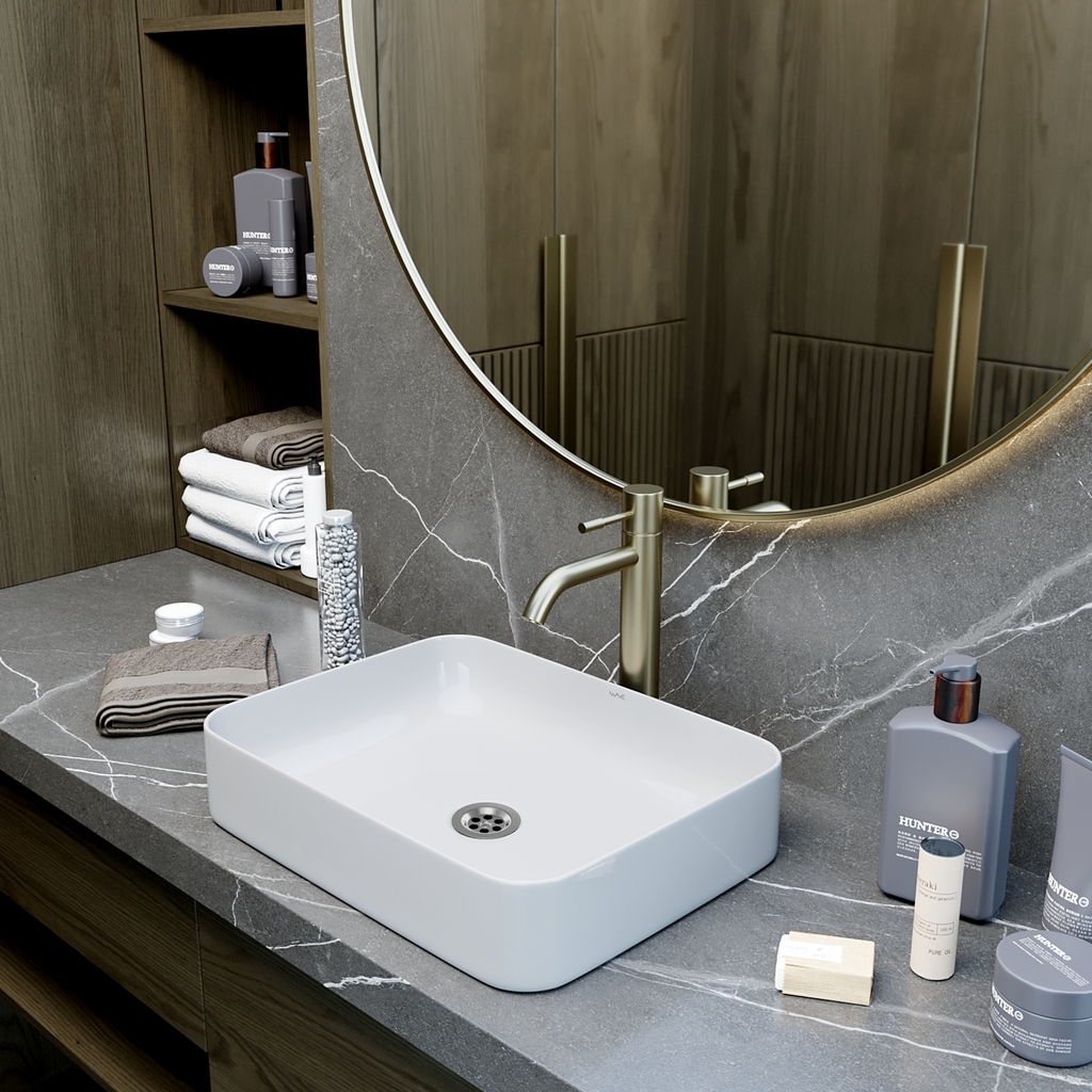 Умывальник WAVE Quadro прямоугольной формы - отличный выбор для современного интерьера ванной комнаты. Максимально удобная и комфортная модель для ежедневных гигиенических процедур.Умывальники WAVE - прекрасный вариант для обустройства как больших, так и маленьких ванных комнат. Их отличают эффектный вид, разнообразие форм и размеров.Накладные умывальники WAVE наилучшим образом сочетают в себе эстетичность и практичность.Их можно расположить в любом удобном месте, поскольку нет необходимости фиксации к вертикальной поверхности.Установленный на столешницу умывальник выглядит стильно и красиво и зачастую служит главным акцентом ванной комнаты. Кроме того, с такой установкой появляется возможность рационально использовать свободную площадь столешницы вокруг умывальника. Умывальники WAVE изготовлены из качественной керамики, характеризуются повышенными эксплуатационными показателями, практичностью, легким уходом.
