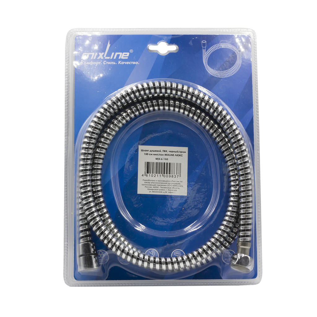 Шланг душевой 150 см имп/кон, ПВХ, черный/хром MIXLINE MIX-6-150 ЛЮКС (блистер)