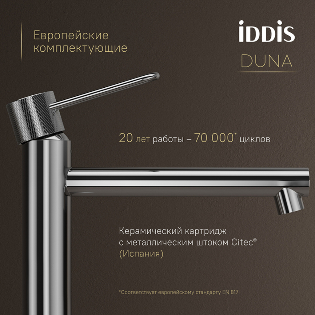 Смеситель для настольного умывальника Duna – воплощение актуальных трендов в дизайне смесителей в безупречном исполнении: фрезеровка, изысканная ручка-петля, модные цвета и фактуры. Ручка выполнена из латуни для сохранения чёткости линий фрезеровки. Европейские комплектующие и технологии — для премиального качества: — Скрытый аэратор Neoperl® (Швейцария) не нарушает дизайн, формирует ровный поток и снижает расход воды. Ключ для обслуживания в комплекте. — Керамический картридж с металлическим штоком Сitec® (Испания) обеспечивает долговечность, точность регулировки и плавный ход ручки. — Гибкая подводка Tucai® (Испания): безопасна для здоровья благодаря шлангу из нетоксичного материала PEX с антибактериальным эффектом, нейлоновая оплетка для защиты от коррозии и износа, увеличенная длина 50 см упрощает монтаж. Простая надёжная установка: металлическая гайка с тремя винтами — стабильность без люфта даже на неровной поверхности. Максимум тишины при работе: благодаря корпусу из нержавеющей стали работает практически бесшумно. Хромированное покрытие устойчиво к потускнению (при должном уходе). Duna – там, где функциональность встречается с красотой. Гарантия на смесители IDDIS® – 10 лет.