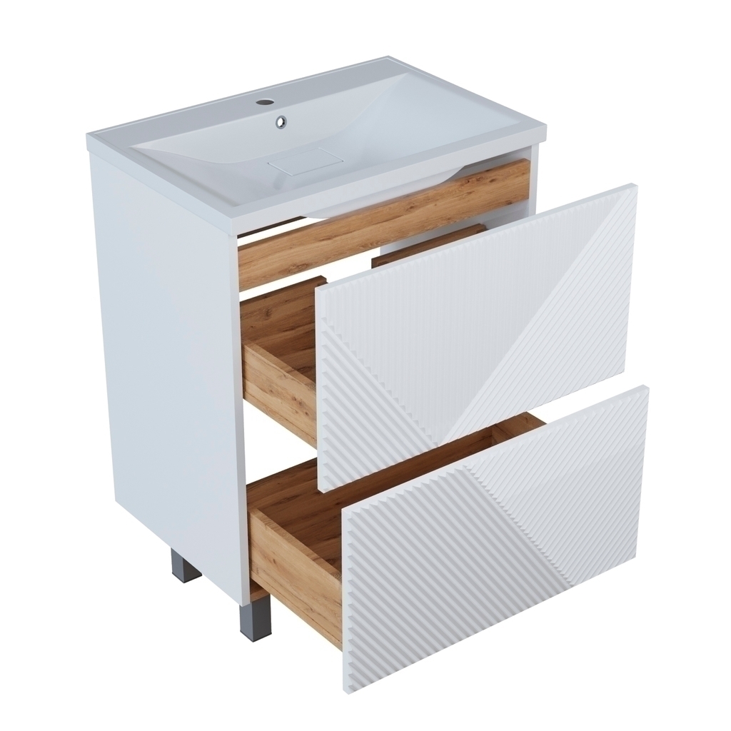 Стильная коллекция ВЕКТОР создана для поклонников геометрии в дизайне. Она идеально впишется в современный интерьер и расставит акценты в монохромном дизайне.Рельефный фасад тумб добавит объемные текстуры в интерьер ванной комнаты.Выдвижные ящики с механизмом открывания push-to-open обеспечивают бесшумное и плавное закрывание.